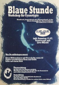 In einem 3-Tägigen Workshop lernten insgesamt 7 Teilnehmer*innen die Cyanotypie kennen. Hierbei handelt es sich um das älteste Photodruck-Verfahren, das mit Sonnenlicht funktioniert. Es wurde mit Schatten experimentiert und herumprobiert was das Zeug hielt – ganz im Sinne des „Old Shadows“. Entstanden sind kleine und große Kunstwerke, von der Postkarte bis zum Jutebeutel. Die anschließend