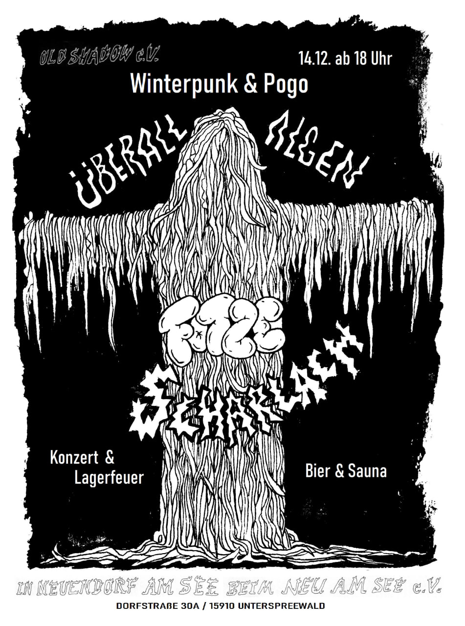 14.12.2024 – WINTER PUNK VOL. 1 Unser erstes Winterkonzert in der Kaschemme vom Kulturverein Neu Am See lief wundervoll. Jung und Alt von nah und fern kamen in überschaubarer Menge zu Speis und Trank, Schrammel-Punk, Feuertonne und anschließender Sauna. Wie immer auf Spendenbasis. Mit dabei waren ÜBERALL ALGEN (Debütkonzert), die mit Witz und Charm „das